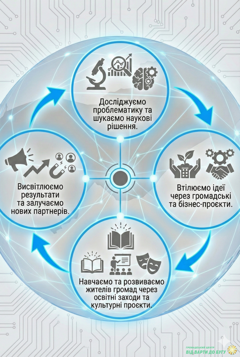 Ми відійшли від застарілих ієрархій. У нас немає "головних" і "підлеглих". Натомість є синергія: кожен учасник мережі підсилює інших своїми компетенціями, ресурсами та ідеями. Ми віримо, що справжні зміни відбуваються на перетині дисциплін — там, де культура зустрічається з бізнесом, а наука — з реальними потребами громади.